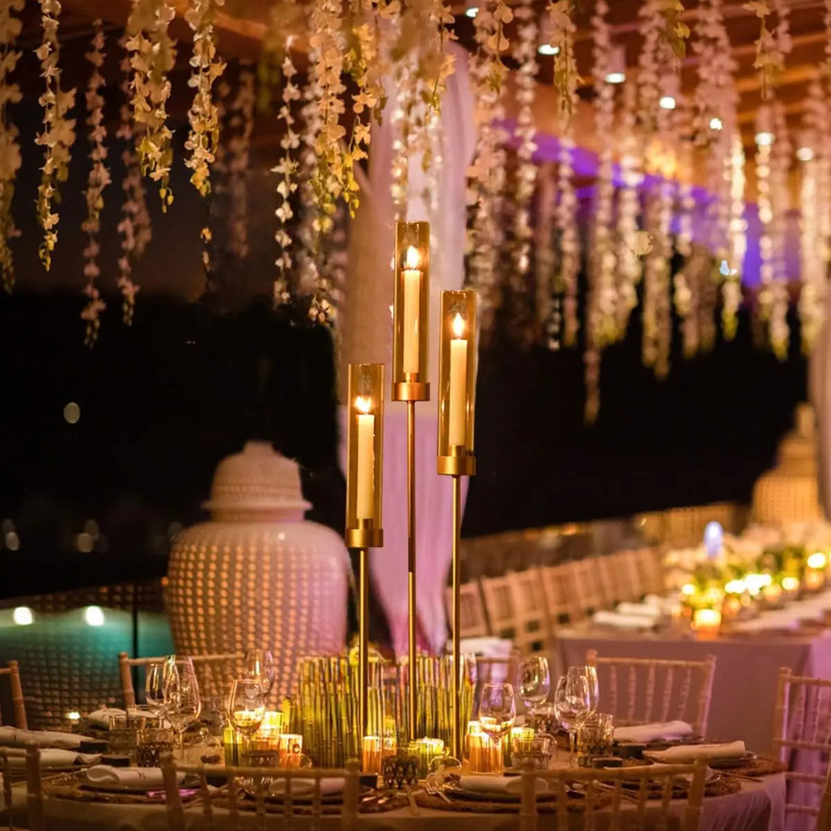 Candlestick Holders Gold for Wedding 8Pcs Taper 3 Arm 33.8Inch Tall Clear Cylinder Metal Candle Stands for Party Home Decor