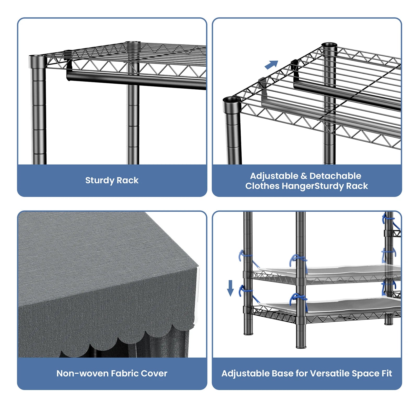This black storage wardrobe is a wise choice for home organization due to its sturdy construction, flexibility, and exceptional load-bearing capacity. Made from high-strength alloy material, it ensures long-lasting durability. The adjustable and removable hanger design offers flexible storage solutions, while the adjustable bottom height allows it to fit into various spaces, maximizing every inch of space. The gray non-woven fabric cover is both dustproof and aesthetically pleasing, complementing the black wardrobe perfectly. Whether it's heavy winter coats or light summer clothes, this wardrobe can easily accommodate them, providing a worry-free storage solution with its strong load-bearing capacity. Choose this wardrobe to make home organization simpler and more efficient!