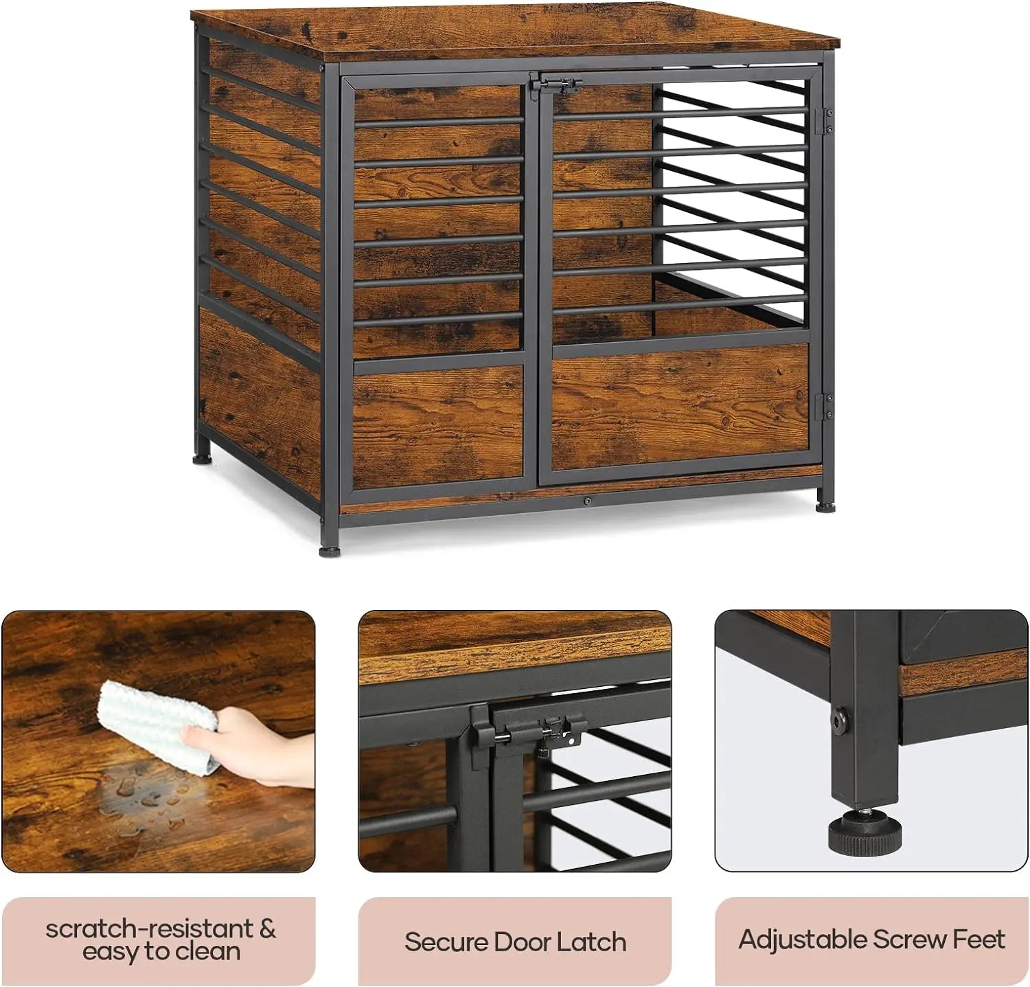 Heavy duty dog frame: Made of thick matte black iron frame and durable particle board frame, this structure is sturdy and chewy. The bottom of the dog house is made of wood instead of metal wire, which is safer and has no foot blockage.