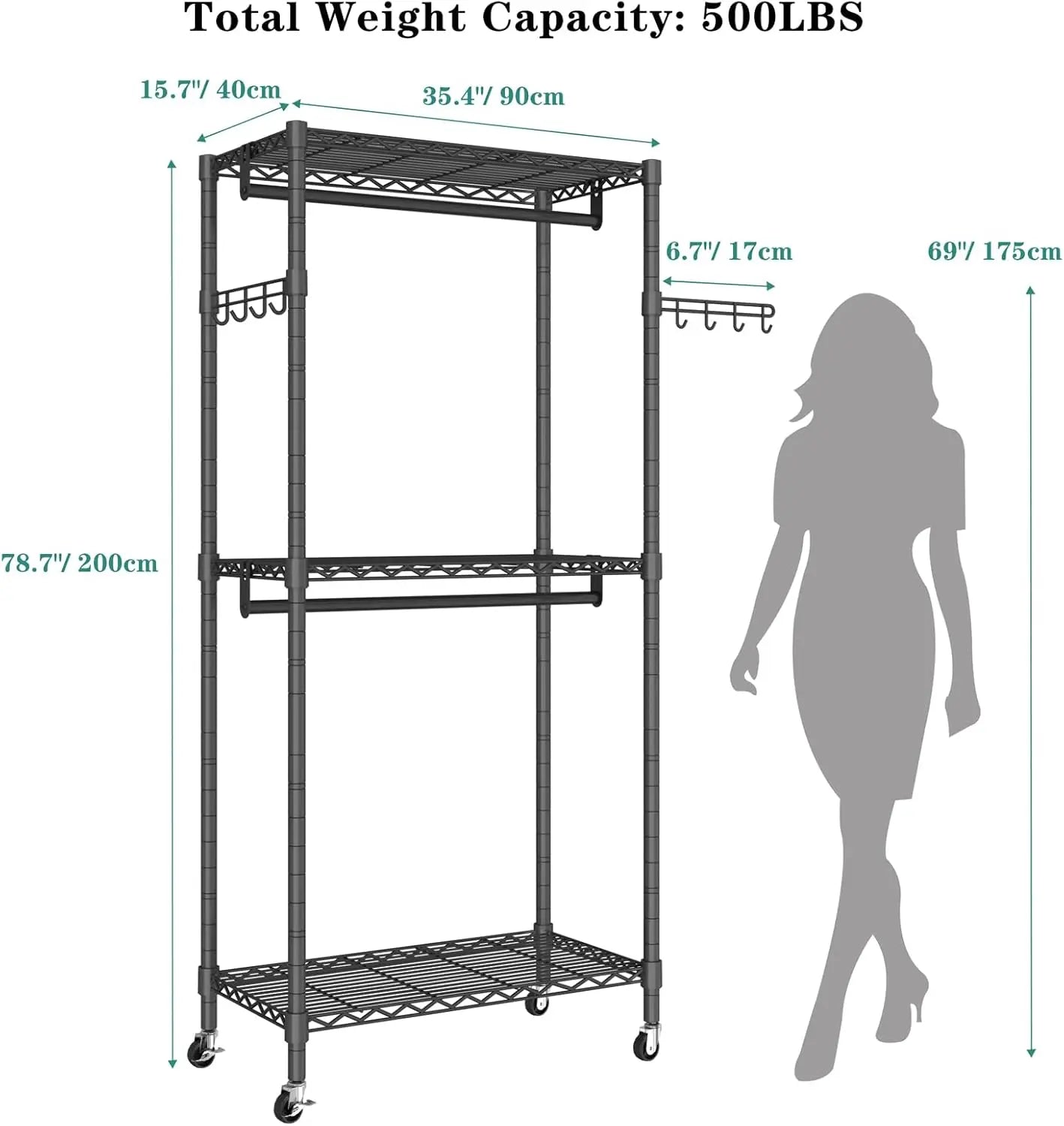 【Dimensions & Load Weight】: 35.4''L x 15.7''W x 78.7\u201dH/ 90x40x200cm (Overall with wheels). Total load weight is 500lb. Made of sturdy high-quality carbon steel, this rolling garment rack is built to last, and withstand heavy loads, making perfect for hanging all types of clothes, from delicate garments to heavierems